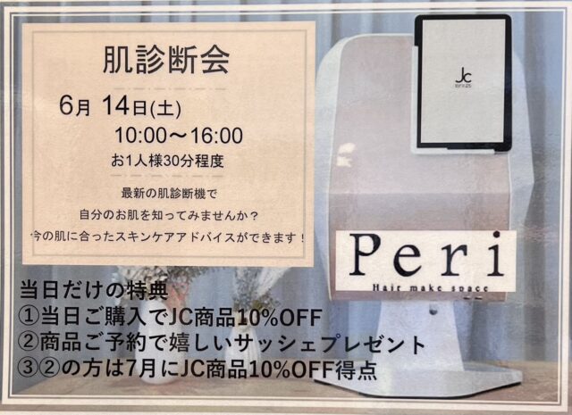 JCクリニックの診察室で実際に使われている肌診断機がperi本店にやって来ます!最新の肌診断機で自分のお肌を知れる大チャンス!肌年齢、油分、水分、シワ,シミ過酸化脂質、毛穴等、細かく分析。JCクリニックのドクターによるコメントもあります。当日は専門インストラクターのスキンケアアドバイスも受けられます。