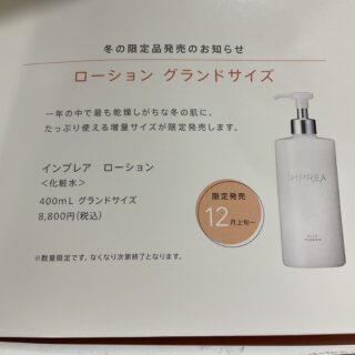 インプレアのローションにグランドサイズが限定発売されます! 通常サイズ(200ml)の倍400mlで・・・ ・・・