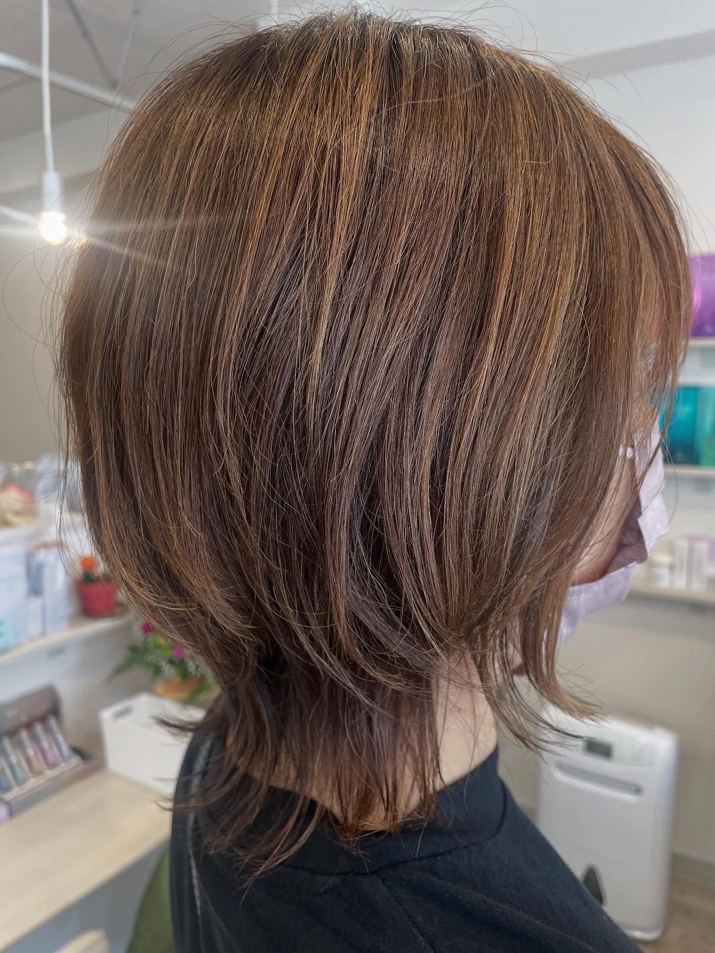 自然なハイライトを何度も重ねることによって根元と白髪が伸びても気にならず動きが出てカッコ可愛いスタイルになりますよ〜