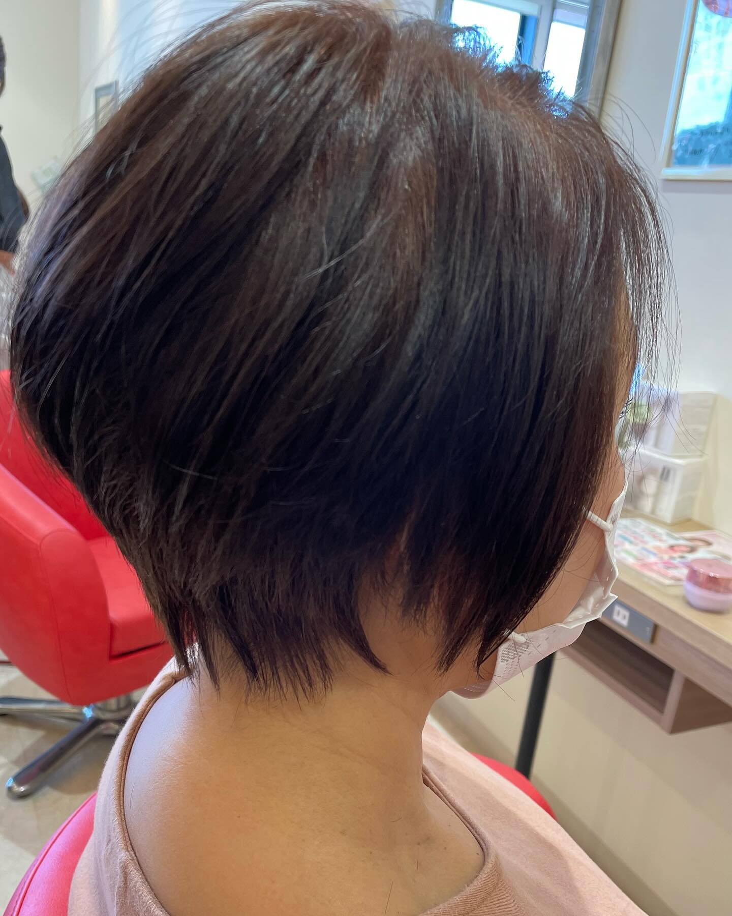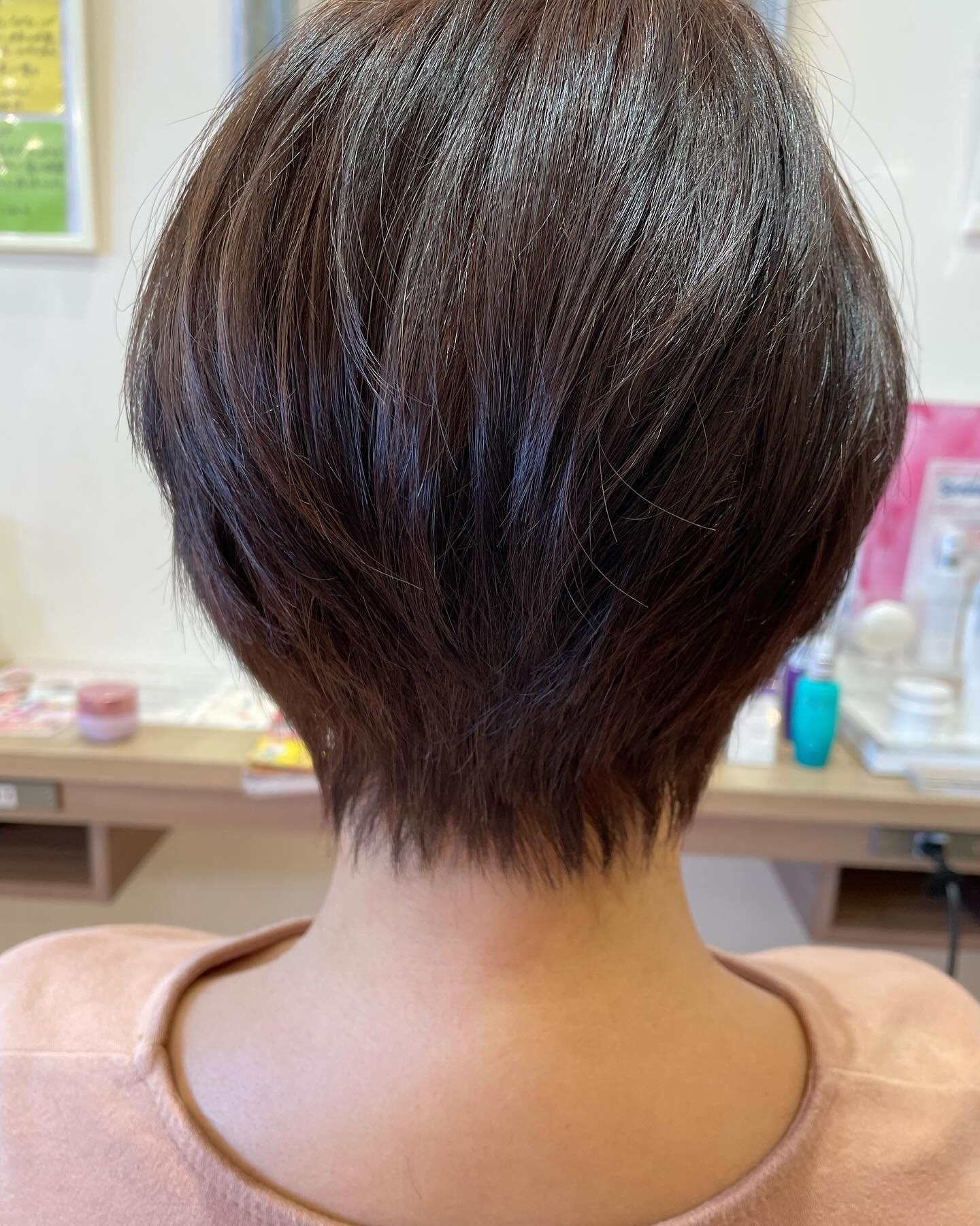 トップにボリュームを持たせネープをタイトにスタイリングしブラウン系で艶感プラス! 担当:加藤