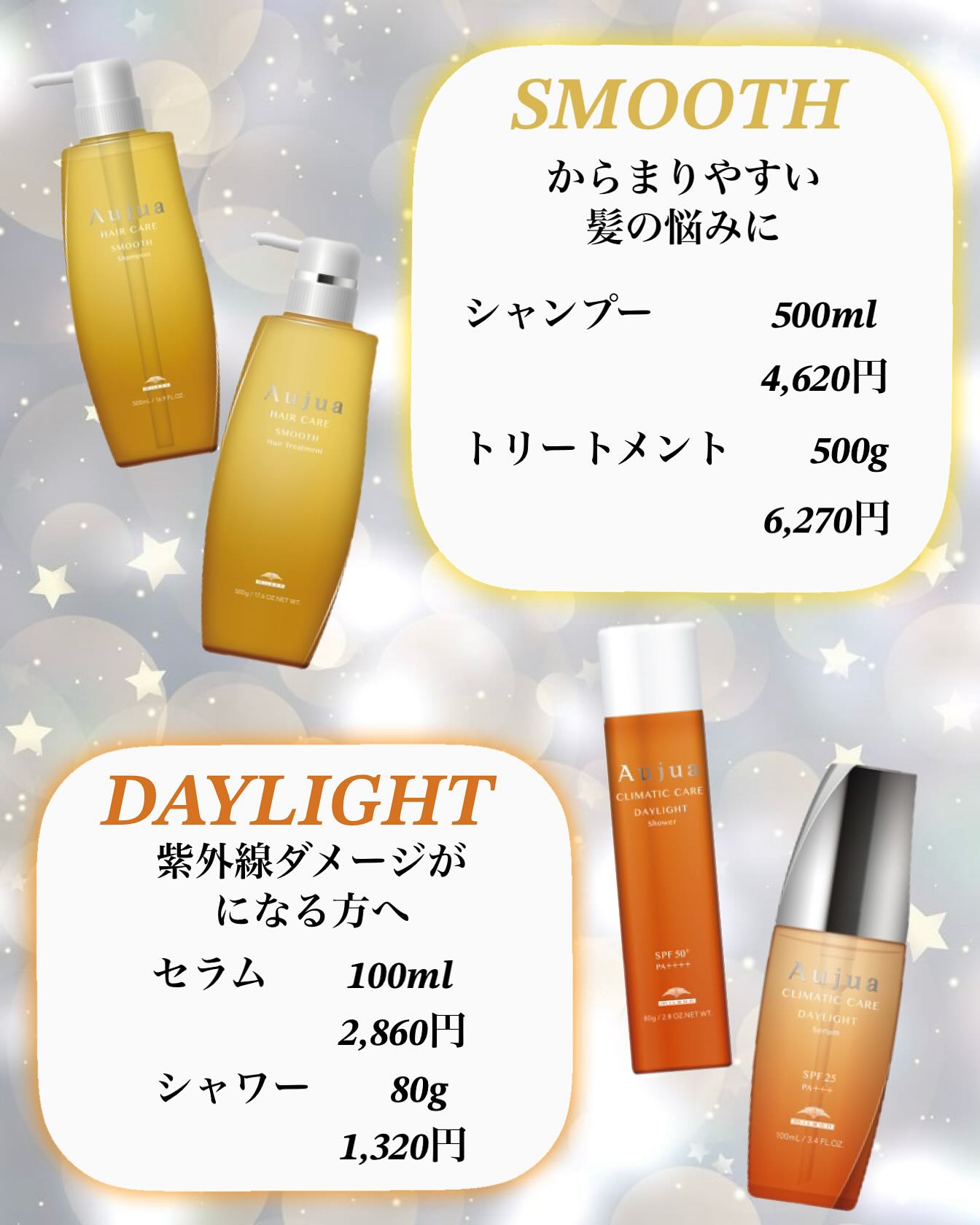 《スタッフ愛用品》 【SMOOTH】 -スムース- からまりやすい髪の悩みに シャンプー 500ml 4,620円(税込) トリートメント 500g 6,270円(税込) 【DAYLIGHT】  -デイライト- 紫外線ダメージがになる方へ セラム 100ml 2,860円(税込) シャワー 80g 1,320円(税込) Peri Periokamoto ピアリ 岡本美容室  宇都宮美容室 女性限定  女性限定サロン aujua milbon オージュア  ミルボン オージュアトリートメント オージュア取扱店  オージュアサロン ヘアケア