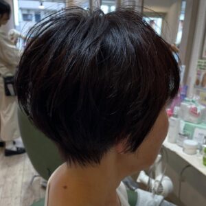 ダークカラーでも軽やかショート 少し毛先に残っていたパーマを生かしてトップにボリュームを出して襟元は・・・ ・・・
