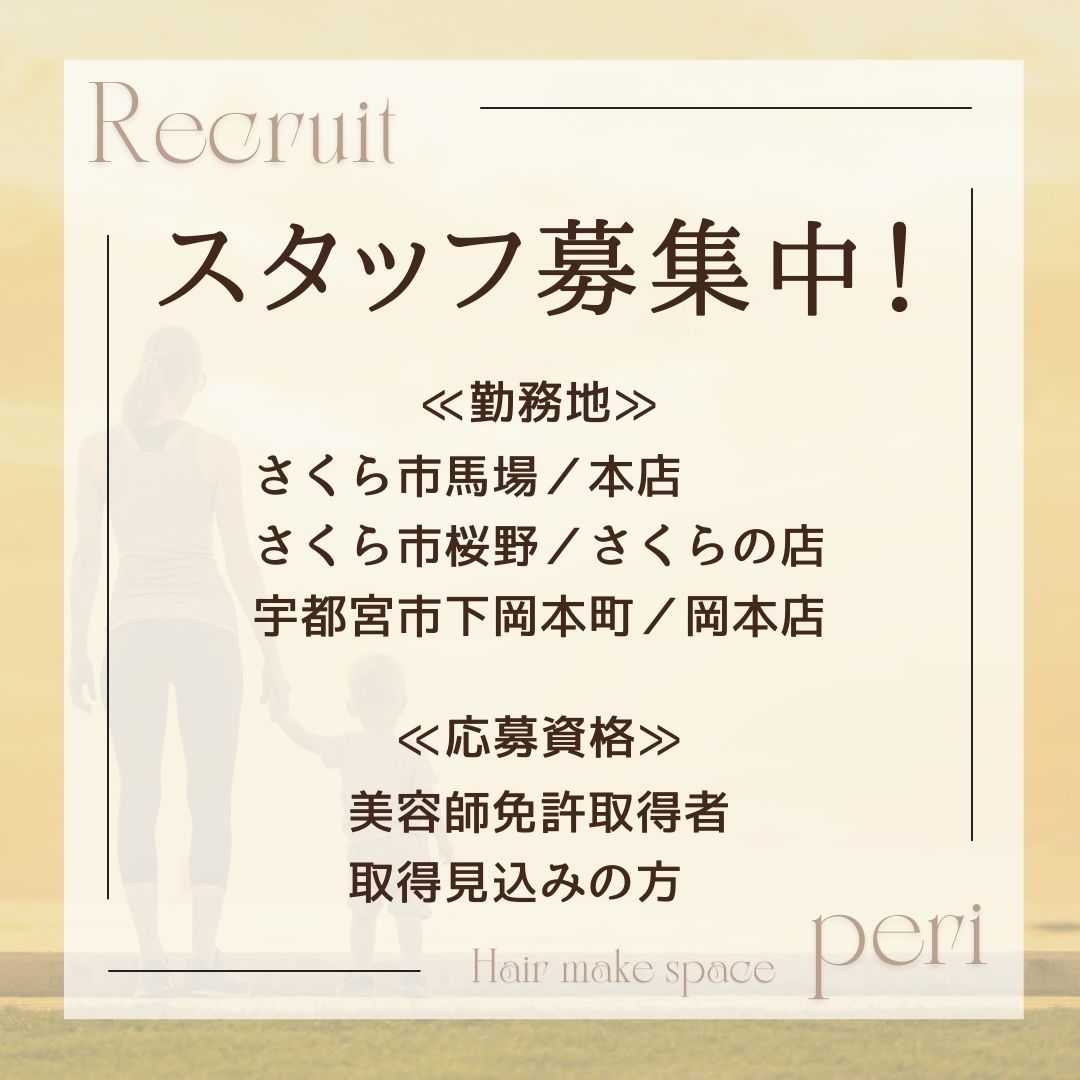 さくら市 さくら市美容室 さくら市美容師求人 日曜日定休日の美容室 ママ美容師 女性だけのサロン 女性美容師 スタッフ募集 美容師募集中 栃木美容室 美容室リクルート 美容師さんと繋がりたい 氏家 宇都宮 岡本 高根沢 矢板 喜連川 大田原 オージュア オージュアソムリエ ミルボン ヘッドスパ 美容室peri さくら市ピアリ 美容室periリクルート