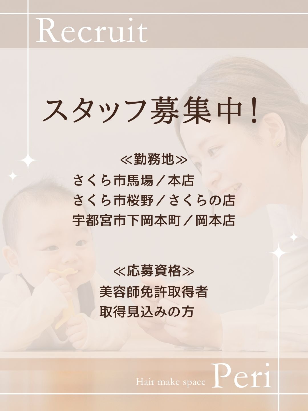 さくら市 さくら市美容室 さくら市美容師求人 日曜日定休日の美容室 ママ美容師 女性だけのサロン 女性美容師 スタッフ募集 美容師募集中 栃木美容室 美容室リクルート 美容師さんと繋がりたい 氏家 宇都宮 岡本 高根沢 矢板 喜連川 大田原 オージュア オージュアソムリエ ミルボン ヘッドスパ 美容室peri さくら市ピアリ 美容室periリクルート